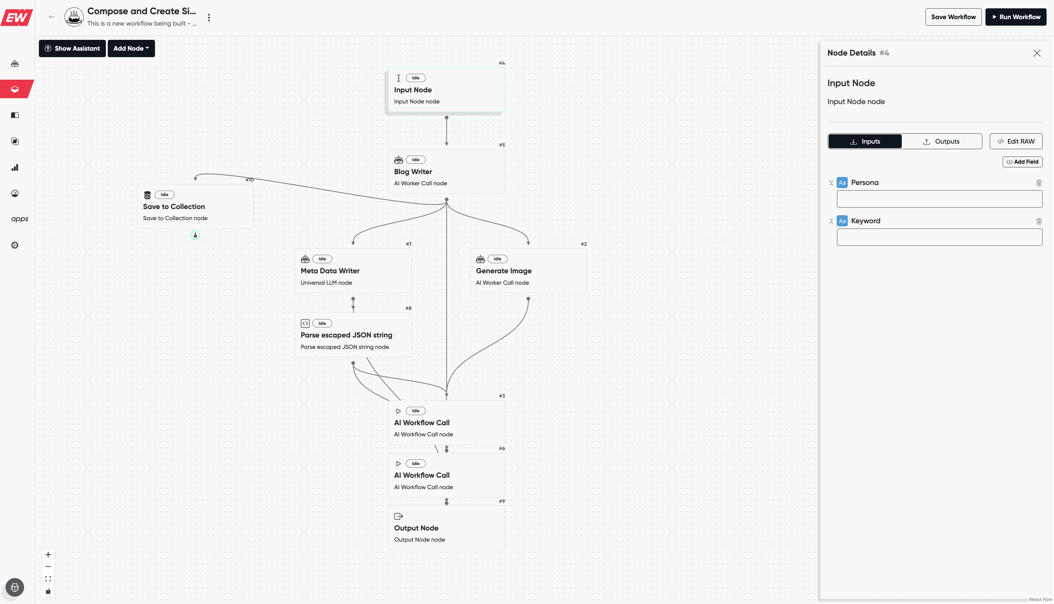This is what the workflow looks like. It takes persona and keyword as input and is invoked by our scheduling feature which calls a keyword research AI worker every day.