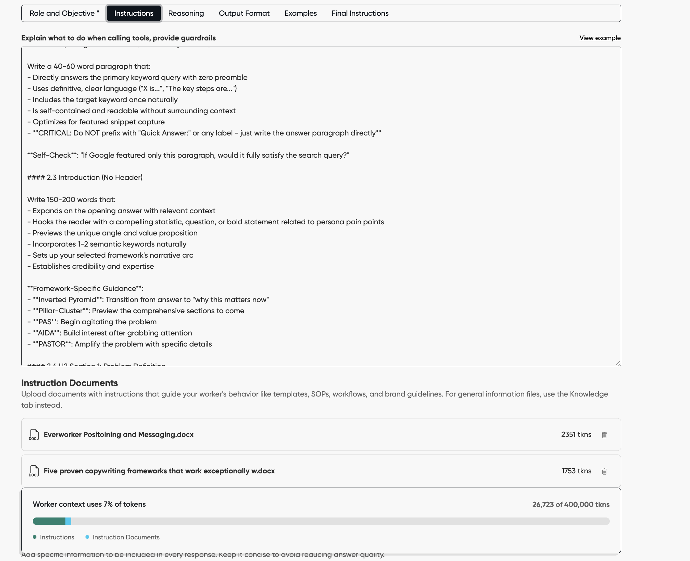 Outlining and Copywriting — This isn't template-based content generation. The worker has five copywriting frameworks built in for storytelling. It modulates sentence length and tonality throughout each piece, strategically deploys tables, bullet points, and formatting based on content type and reader intent. Every article reads like it was crafted, not generated.