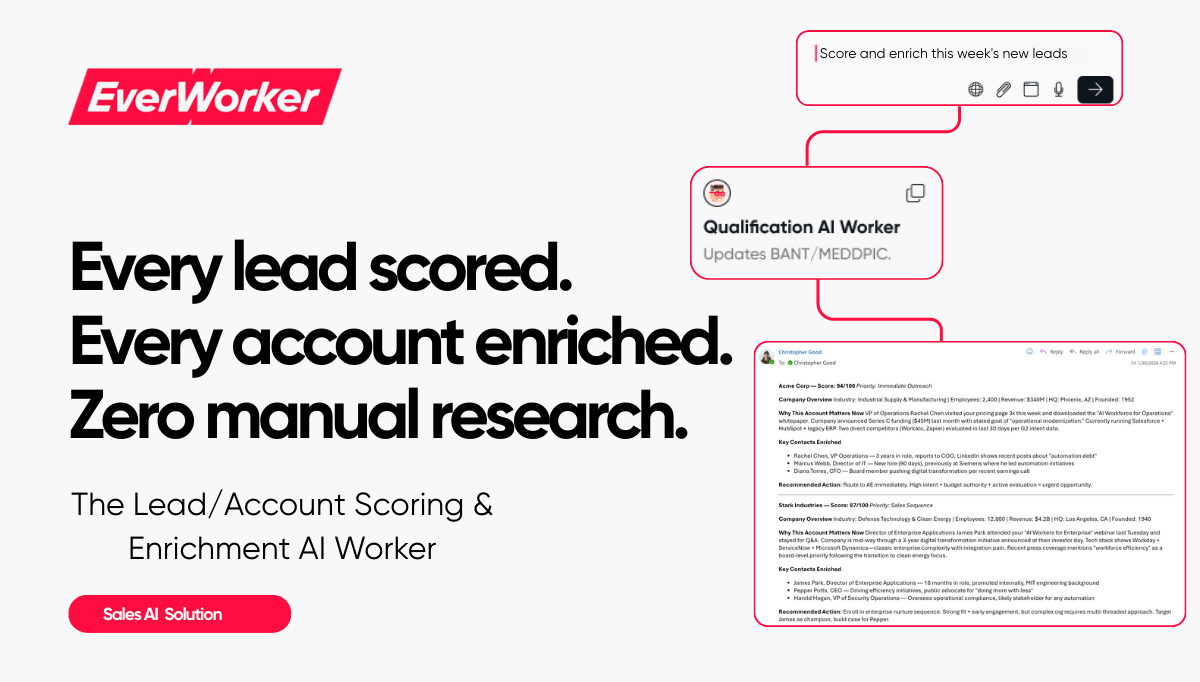 The Lead/Account Scoring & Enrichment AI Worker is built on EverWorker's AI Worker platform. That means you can build something similar for your own organization—customized to your ICP, scoring criteria, data sources, and tech stack.